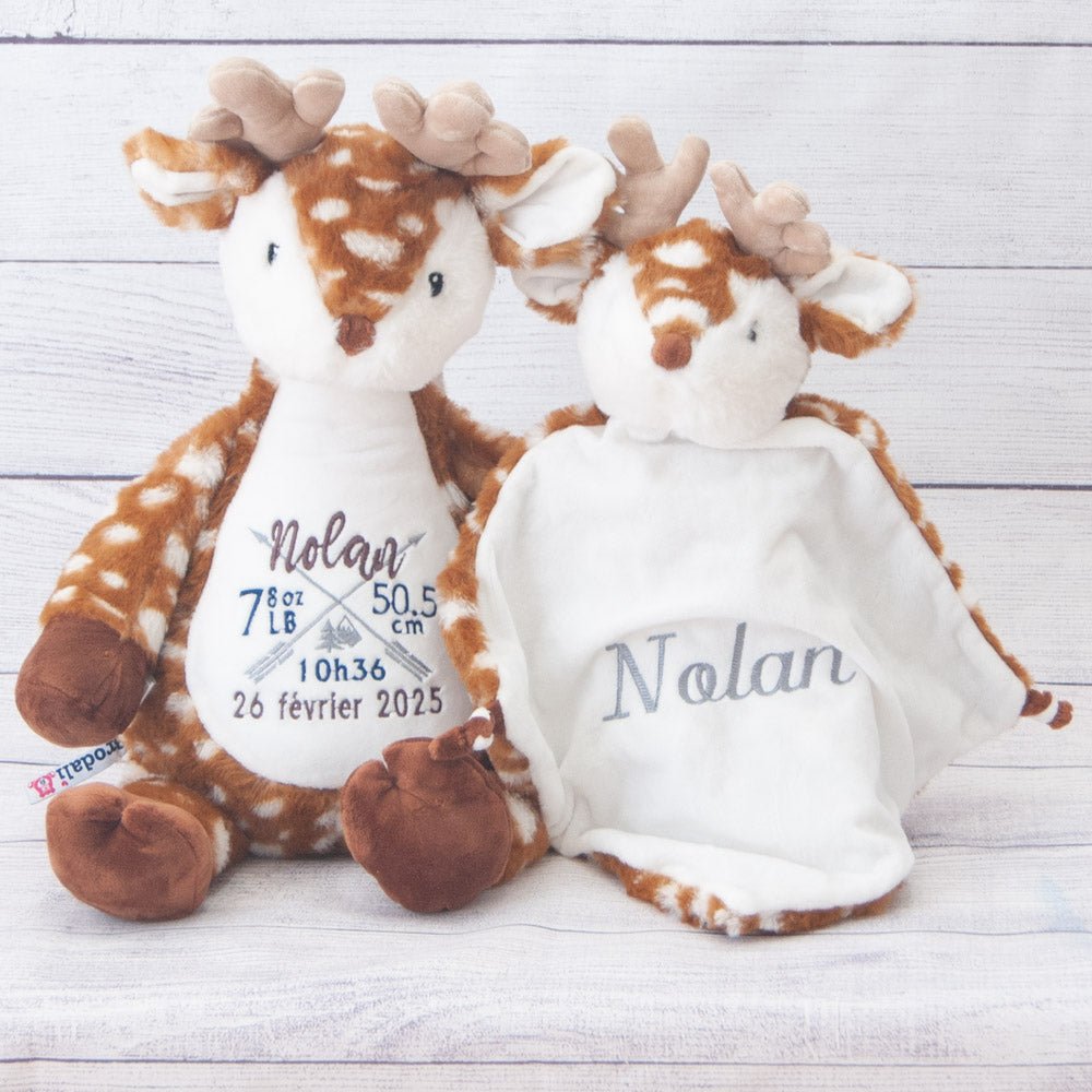 - Mini doudou chevreuil avec prénom inclus (L'endos de la broderie sera visible au dos de la doudou)