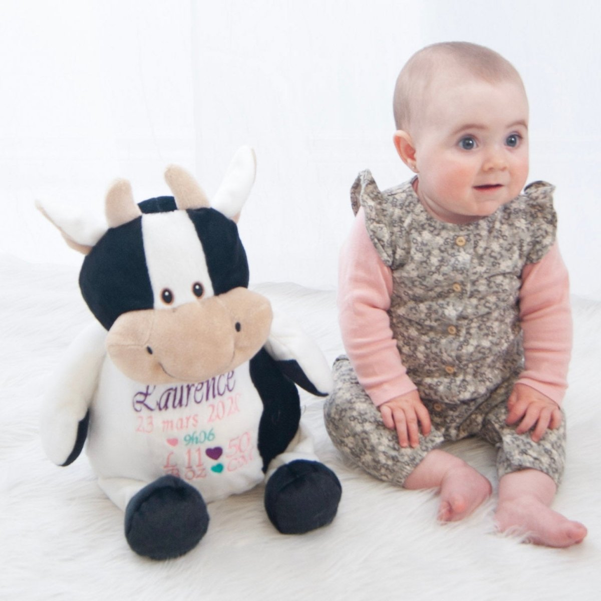 Impossible de résister au charme de cette vache dodue au pelage noir et blanc! Avec son air moelleux et rigolo, elle est parfaite pour offrir un souvenir personnalisé rempli de tendresse.